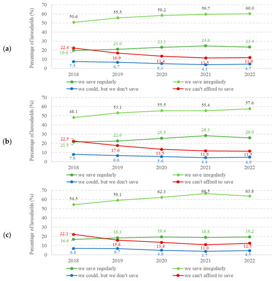 Trends in saving behaviors in households: all (a), urban (b), and rural (c). Source: own elaboration based on non-identifiable microdata from BBGD [42].