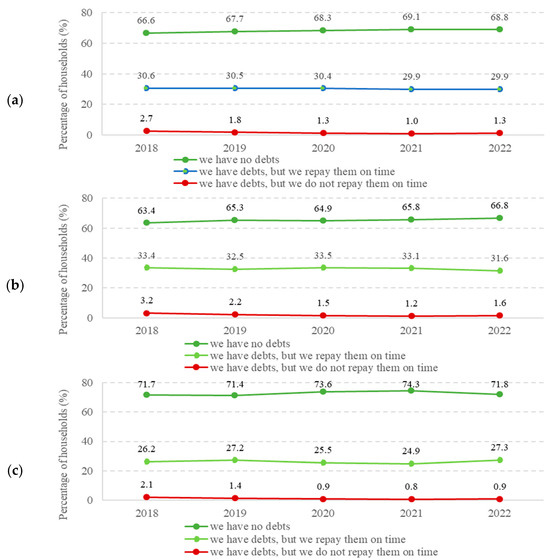 Rural households exhibited greater debt aversion, with the percentage of debt-free households ranging from 71.7% in 2018 to 74.3% in 2021, before decreasing by 2.5 pp in 2022. In urban areas, this percentage increased throughout the study period, from 63.4% to 66.8%. Among urban households, the deterioration in income conditions in 2022 was reflected in a slight increase (by 0.4 pp) in the percentage of households struggling with timely debt repayments. These results confirm the findings of Szustak et al. [19], which indicate that the decline in savings among Polish households may be due to their reluctance to incur debt during uncertain times.
