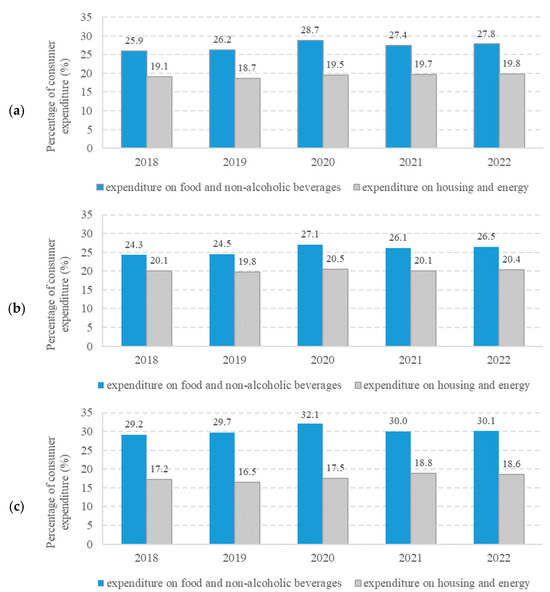 In narrow terms, a household’s financial situation is identified with the level of disposable income or the amount of consumer spending. However, neither of these financial categories alone fully captures the concept of financial situation, despite the fact that consumption expenditures reflect the main purpose of households, which is to meet the needs of their members. At the same level of income, a higher share of consumer spending may imply a worse financial situation due to a lower savings rate [29]. However, a lower share of expenditures in income may also be associated with the need to service debt obligations. Additionally, assessing the financial situation requires accounting for the broader environment, since the same level of income and spending may reflect different financial situations for households in a large metropolis versus a peripherally located village [25]. Thus, in the opinion of the authors of this study, it seems reasonable to include the burden of fixed expenses, such as food and housing (including energy), in the assessment. The rationale is that at the same income level, a higher share of fixed expenditures reduces a household’s fund for discretionary spending, which is a clear indicator of a worse financial situation.