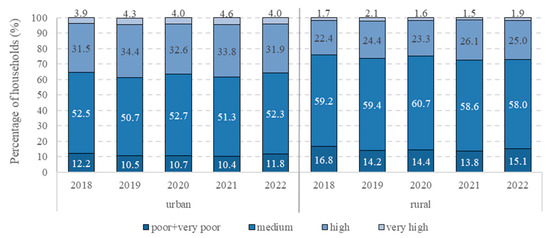 Throughout the study period, which includes two years before and three years during the pandemic, the financial situation of rural households was consistently worse than that of urban households (Figure 6). Each year, rural households had a higher percentage of low or very low assessments, 14–17%, compared to 10–12% in urban areas. Conversely, urban areas had a higher percentage of high or very high assessments—35–39% versus 24–27% in rural areas.