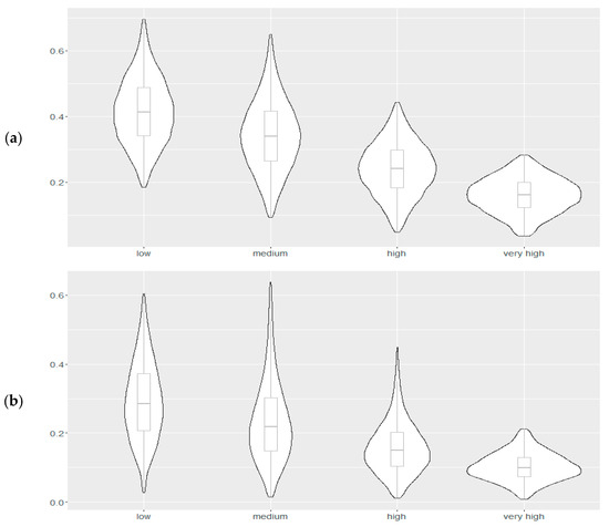 The value of the synthetic indicator was calculated for each household, which led to the assessment of its financial situation according to the classification presented in Table 1. Since the percentage of households with a “very low” financial situation did not exceed 0.2% each year, it was decided to combine the two lowest financial assessment classes, i.e., “low + very low” (Figure 6).