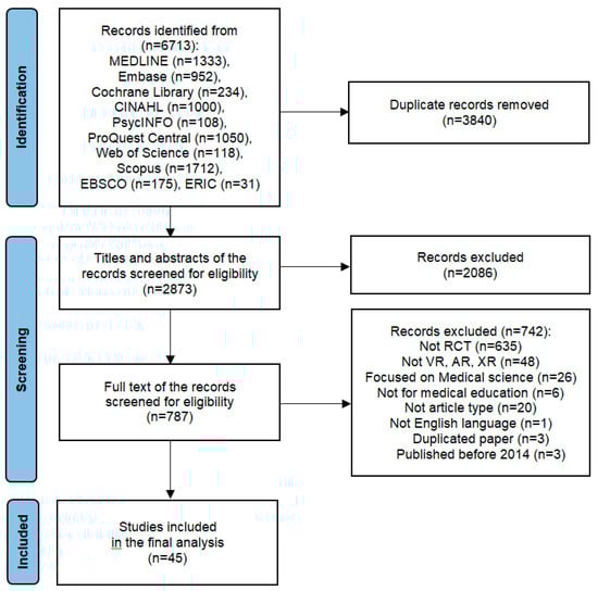 The databases of MEDLINE (Ovid), Embase (Elsevier), Cochrane Library (Wiley), CINAHL (EBSCO), PsycINFO (EBSCO), ProQuest Central, Web of Science (Clarivate Analytics), Scopus (Elsevier), EBSCO (Academic Search Complete), and the Education Resources Information Centre (EBSCO) were searched to retrieve peer-reviewed articles from the field of medicine and education. Articles published between 1 January 2014 and 11 July 2024 were retrieved using the following terms and protocols: (“VR” OR “virtual” OR “virtual reality” OR “VRS” OR “VRE” OR “AR” OR “augmented” OR “augmented reality” OR “MR” OR “mixed reality” OR “XR” OR “extended reality”) AND (“medical” OR “medicine” OR “doctor” OR “dental” OR “dentistry” OR “complementary medicine” OR “traditional chinese medicine” OR “korean medicine” OR “nurse” OR “nursing”) AND (“education” OR “teach” OR “teaching” OR “learn” OR “learning” OR “lesson” OR “instruction” OR “practice” OR “clerkship” OR “clinical practice” OR “clinical clerkship” OR “experimental education” OR “experimental teaching” OR “internship” OR “residency” OR “bedside teaching” OR “student” OR “undergraduate” OR “intern” OR “resident” OR “fellow”). Appendix A presents the details of the search strategy used for each database.