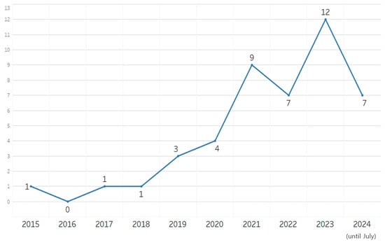Table 1 presents the characteristics of the 45 studies included in this review. Several studies related to this field were published after 2019, with most studies being published in 2023 (Figure 2). The search was conducted until July 2024; thus, only seven studies published in the first half of 2024 were included in this review. This finding indicates that the number of studies related to this field has increased in recent years. The studies included in this review were conducted in various countries, with the largest number of studies being conducted in Asia (n = 17), followed by Europe (n = 14) and North America (n = 10). A notably higher concentration of studies was observed in Asia, Europe, and North America (Figure 3). A total of 3329 participants were included in the 45 studies, with the number of participants ranging from 13 to 164 in each study. Classifying the studies according to specialized education fields revealed that 26 [20,21,22,27,46,47,48,49,50,51,52,53,54,55,56,57,58,59,60,61,62,63,64,65,66,67], 14 [26,28,29,68,69,70,71,72,73,74,75,76,77,78], and five [30,79,80,81,82] papers were published in the domain of medical, nursing, and dental education, respectively. Classifying the studies according to the usage of VR was overwhelmingly high, with VR being used in 38 (84.4%) of the 45 studies. AR, including AR and MR utilizing AR, was used in five (11.1%) studies.