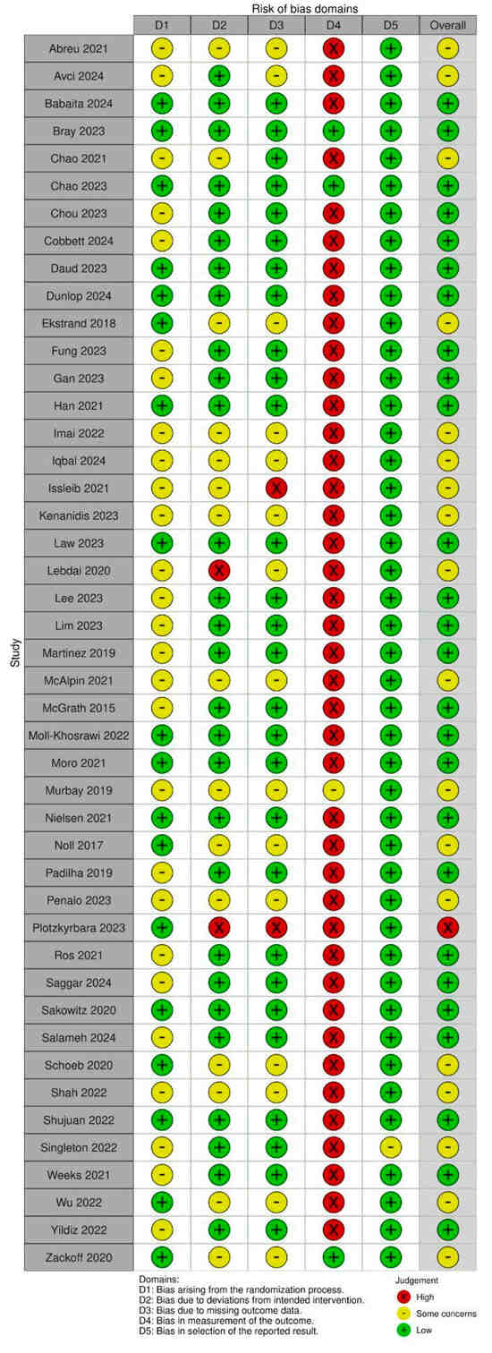 Figure 4 presents the results of the assessment according to the Cochrane risk-of-bias (ROB) 2.0 criteria. In terms of the domain of randomization (domain 1), ROB 2.0 criteria revealed allocation concealment in 17 studies [21,22,27,47,48,50,55,59,60,61,62,69,74,75,77,79,82]. Among these 17 studies, six [27,59,61,62,67,82] were double-blind. Eighteen studies, including one study that did not overlap with the allocation concealment group above [67], were categorized as “low-risk”. The remaining studies were all RCTs categorized as “some concerns”. In terms of the bias assessment of the interventions (domain 2), ROB 2.0 criteria revealed that two studies (4.4%) had a high risk of bias. One study involved participants who received duplicate interventions [74]. Another study [56], wherein the difference in the number of dropouts between the intervention and control groups was seven, was categorized as “high-risk”; however, no detailed explanation was provided for this. Fifteen studies (33.3%) [20,22,46,48,51,52,53,54,62,65,67,73,77,80,81] were categorized as “some concern”, as the exact number of participants excluded from receiving the intervention was unclear. Twenty-eight studies (62.2%) [21,26,27,28,29,30,47,49,50,55,57,58,59,60,61,63,64,66,68,69,70,71,72,75,76,78,79,82] were categorized as “low-risk”.