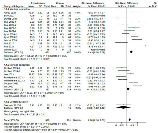 A meta-analysis was performed using a fixed model, as the studies included in the analysis of the knowledge levels exhibited high heterogeneity (I2 = 93%, p < 0.0001). An analysis of nine studies (13 results) on medical education revealed that the improvement in knowledge was significantly higher in the experimental group than in the control group (SMD: 0.43, 95% CI: 0.28–0.58, p < 0.0001). An analysis of five studies (seven results) on nursing education revealed that the difference between the experimental and control groups was not significant (SMD: 0.13, 95% CI: −0.02–0.29, p < 0.00001). An analysis of one study on dental education revealed that the difference between the groups was not significant (SMD: −0.30, 95% CI: −1.02–0.42, p > 0.05). In summary, the results of the meta-analysis of 21 results from 15 studies involving 1599 participants indicated that VR education yielded a significant improvement in knowledge (SMD: 0.28, 95% CI: 0.18–0.39, p < 0.00001) (see Figure 5).
