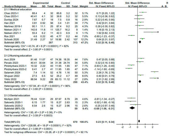 A fixed-effects model was used to perform the analysis, as the studies included in the score analysis for skills exhibited high heterogeneity (I2 = 92%, p < 0.00001). An analysis of seven studies (nine results) in the field of medical education revealed that the skill scores in the experimental group exhibited a more significant improvement than those in the control group (SMD: 0.32, 95% CI: 0.16–0.49, p < 0.00001). An analysis of six studies (seven results) in the field of nursing education revealed a more significant improvement in the skill scores in the experimental group than that in the control group (SMD: 0.32, 95% CI: 0.15–0.49, p < 0.0001). An analysis of two studies (three results) in the field of dental education revealed a more significant effect in the control group than in the experimental group (SMD: −0.69, 95% CI: −1.06 to −0.31, p < 0.001). In summary, the results of a meta-analysis of 19 results from 15 studies involving a total of 1314 participants revealed that VR education yielded a significant improvement in clinical skills (SMD: 0.23, 95% CI: 0.11–0.34, p < 0.00001) (see Figure 6).