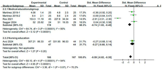 A fixed-effects model was used to perform the analysis, as the studies included in the analysis of technique performance time exhibited high heterogeneity (I2 = 94%, p < 0.00001). An analysis of three studies (four outcomes) on medical education revealed that the skill performance in the experimental group was significantly shorter than that in the control group (SMD: −0.74, 95% CI: −1.02 to −0.45, p < 0.00001). An analysis of one study on nursing education revealed no significant differences between the experimental and control groups (SMD: −0.27, 95% CI: −0.68 to 0.14, p > 0.05). In summary, the results of a meta-analysis of four studies (five results) involving a total of 333 participants revealed that VR education had a positive effect on reducing the time required for performing the procedure (SMD: −0.59, 95% CI: −0.82 to −0.35, p < 0.0001) (see Figure 7).