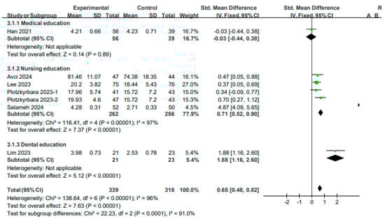 Analyses of educational satisfaction were performed using a fixed model, as the studies included exhibited high heterogeneity (I2 = 96%, p < 0.00001). An analysis of one study on medical education revealed no significant differences between the experimental and control groups (SMD: −0.03, 95% CI: −0.44–0.38, p > 0.05). An analysis of four studies on nursing education (five outcomes) revealed that the satisfaction scores in the experimental group were significantly higher than those in the control group (SMD: 0.71, 95% CI: 0.52–0.89, p < 0.00001). An analysis of one study on dental education revealed that the satisfaction scores in the experimental group were significantly higher than those in the control group (SMD: 1.88, 95% CI: 1.16–2.60, p < 0.00001). In summary, the results of a meta-analysis of six studies (seven results) involving a total of 657 participants revealed that VR education yielded higher satisfaction levels (SMD: 0.65, 95% CI: 0.48–0.81, p < 0.00001) (see Figure 8).