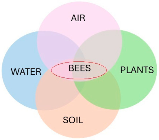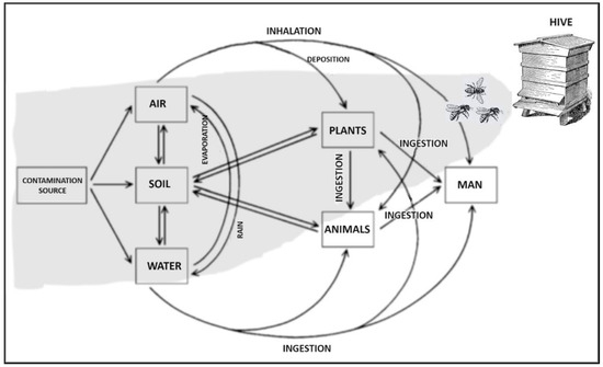 Bees indicate the presence of contamination in the environment in two ways: through increased mortality and the residues of certain toxic substances in honey, pollen, and larvae, such as heavy metals, herbicides, fungicides, and radionuclides. Given that they possess several important morphological, ecological, and behavioral characteristics as biological indicators, bees help create so-called environmental health maps related to, for example, pesticides, using mortality rates, apicide numbers, the type and risk level of the identified compounds, etc. They are highly effective and precise in detecting the spatial range and quality of pollution comprising different compounds [2]. Bees are ubiquitous, are easy to raise, have moderate food requirements, are covered with hair, are sensitive to most plant protection products, have a very high reproduction rate, have a relatively short life span, and are very mobile. Indeed, bees can cover a wide area: by flying, they can sample almost every segment of the environment—soil, water, plants, and air. If there is a contamination source due to various hydrological processes (evaporation or rain), contamination circulates in water between individual components of the environment (inanimate nature) and reaches living components (plants, animals, and humans), including bees, which, in different ways (through inhalation or ingestion), are also exposed to this effect (Figure 2). Research shows that Pb concentrations are higher in the body of bees in urban and industrial environments, while higher Ni and Cr concentrations can be found in bees in the natural environment, as can Pb if transported and deposited through the air from a distant source [27].