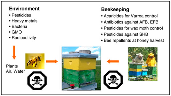 Bogdanov lists two sources of pollutants in bee products, namely, beekeeping practices and the environment (Figure 3). Heavy metals (such as Cd, Hg, and Pb, mostly from industry and traffic), pesticides (bactericides, fungicides, herbicides, and insecticides), radioactive elements (primarily 40K and 137Cs), pathogenic bacteria, and genetically modified organisms can enter bee products from the environment. Beekeeping can be a source of contamination with acaricides, organic acids, substances from essential oils, antibiotics, para-dichlorobenzene, and chemical repellents. Beekeeping practices pose a greater danger than bee products that are contaminated by the environment. Thus, the greatest risks are antibiotics for honey, acaricides for wax, Pb and acaricides for propolis, pesticides for pollen, and antibiotics for royal jelly. Lead spreads through the air in areas of intense motor traffic and thus ends up in nectar and honeydew. It is not transmitted by plants. Cadmium originating from the metal industry and incinerators ends up in the soil and is transported by plants to nectar and honeydew. However, because of nectar filtration, bees are still better indicators of Pb and Cd than their products [36].