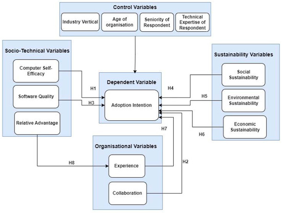 This study uses computer self-efficacy, relative advantage, and software quality as socio-technical variables; these are based on the socio-technical systems theory and constitute the socio-technological context in this model. Blockchain technology is socio-technical in nature; thus, socio-technical theory should be used to examine it [12]. Moreover, collaboration and experience variables constitute the organizational context. Collaboration is a matter of culture and work design for an organization; it affects how the organization may respond to a technology transition supposed to streamline operations and bring efficiency. Meanwhile, experience measures how the organization can leverage the benefits of the new technology. Finally, the sustainability variables (economic sustainability, social sustainability, and environmental sustainability) constitute the sustainability context. Figure 3 illustrates the research model, with the variables drawn from the literature review and the SOS framework.