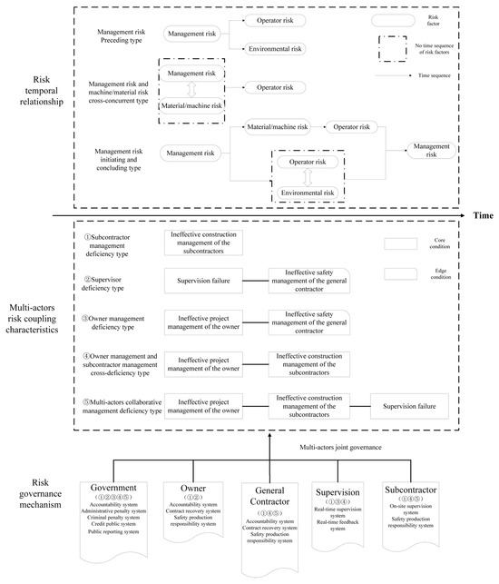 Due to the complexity and dynamics of underground construction projects, safety risk management has experienced significant challenges restricting the sustainable development of underground space. The research on risk causal chains and risk coupling has yet to reveal the dynamic interactive characteristics of these risk factors and their temporal relationships over time. This study utilized a complex system view for safety risk analysis, using 37 accident investigation reports of underground construction projects. Combined with two novel and emerging analytical methods, temporal qualitative comparative analysis and crisp-set qualitative comparative analysis, this study discusses the temporal relationship of risk factors to the cause of accidents and explores the multi-actor coupling characteristics of management risk. The findings indicate that (1) compared with general construction projects, underground construction should pay more attention to management safety risks because they have an obvious time lag effect expressed in all accident causation paths, namely, preceding management risk, management risk, and machine/material risk cross-concurrently, and management risk initiation and (2) underground construction project management risks have three key main paths, namely, single-actor-dominated management deficiency (supervisors, owners, and subcontractors that cause management risks as a single-core actor) and dual-actor-dominated management deficiency (owner and subcontractor as dual core actors of management risk). Multi-actor-dominated management deficiency (owners, subcontractors, and supervisors are the multiple core actors of management risk). This study thus developed a temporal governance framework of underground construction safety risks based on the synergy of multi-actors and proposed risk governance strategies, such as synergistic multi-actor governance, to consider the temporal relationship of safety risk. This study further reveals the temporal and coupling characteristics of safety risks to enrich the risk casual chain theory and risk coupling theory and establish a systematic risk analysis framework for new guidance for safety and risk management for underground construction projects.