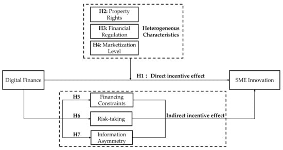 Digital finance can indirectly drive SME innovation through various mechanisms. Firstly, digital finance rapidly responds to the funding needs of SMEs and leverages credit evaluation systems to quickly extract basic information and credit data. This enables a quick assessment of their operational conditions and financial credibility, effectively alleviating their financing constraints. Secondly, digital finance enhances the flexibility of capital acquisition for SMEs, reducing the likelihood of forgoing positive net present value projects. This increases their capacity to cope with external shocks and uncertainties while also reducing the probability of financial difficulties, thereby raising their risk tolerance [16]. Lastly, digital finance effectively mitigates information asymmetry through technologies such as big data, artificial intelligence, and blockchain. These technologies enable the collection, processing, and analysis of vast amounts of user data, providing more transparent information and allowing financial institutions to more accurately assess users’ credit risk. Additionally, smart contracts and distributed ledger technology enhance the transparency and security of transactions, reducing information asymmetry and reducing the likelihood of moral hazards and adverse selection, thereby incentivizing innovation in SMEs [17]. Therefore, this paper proposes the following hypotheses: