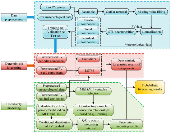 To sum up, this paper proposes a probabilistic forecasting method for PV power that considers different component characteristics under time series decomposition for constructing prediction models and probability modeling. The innovation lies in developing a framework that combines deep learning prediction models with multidimensional variable uncertainty quantification models based on time series feature decomposition, where different features of the time series are represented as periodic, trend, and residual components. The objectives include: (1) accurately predicting the periodic component of PV power via TimeMixer; (2) efficiently predicting the trend component using LSTM’s long-term memory capability; (3) constructing a multidimensional joint distribution based on Q-Learning optimized Vine Copula to quantify its stochastic process and obtain probability distribution results for the forecast time using QR. The detailed implementation process of this method is as follows. Firstly, STL is used to decompose the PV time series into periodic, trend, and residual components. A TimeMixer-based periodic component prediction model and an LSTM-based trend component prediction model are constructed. The mutual information (MI) method and variance inflation factor (VIF) method are used to screen highly correlated influencing factor variables for the PV residual component for subsequent Vine Copula modeling. Q-Learning is used to construct the variable connection relationships of the screened variables. Then, the maximum likelihood estimation (MLE) and Bayesian information criterion (BIC) are used to determine the parameters of the Vine tree, forming an optimal Vine Copula structure to generate a joint probability distribution of PV residuals and multiple factors. Finally, QR is performed based on the derived conditional distribution of PV residuals to obtain interval results. Probabilistic forecasts are obtained by combining deterministic predictions of periodic and trend components with uncertainty models of residual components. Simulation verifications are conducted using PV output information collected from the DKASC Alice Springs PV station in Australia. Results demonstrate that compared with Transformer, TCN, CNN-GRU, LSTM, XGBoost, and traditional Vine Copula methods, the proposed method exhibits more powerful performance in probabilistic forecasting. Meanwhile, each model utilized in this method can effectively handle the corresponding PV component information, outperforming several mentioned state-of-the-art models. The main contributions of this paper are as follows.