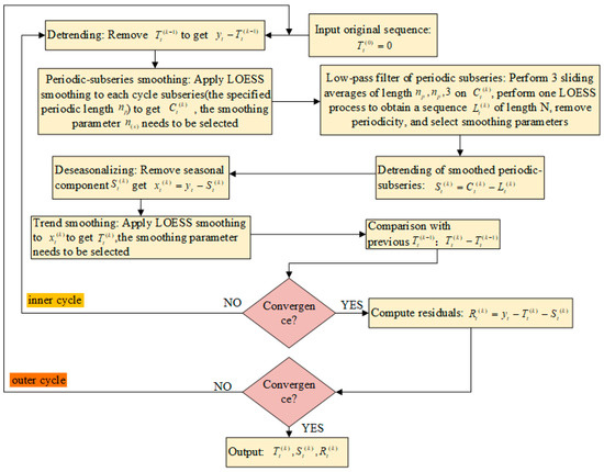 35]. The algorithm is based on a double-layer structure of inner and outer loops. The inner loop obtains periodic and trend components through LOESS smoothing operations on the detrended sequence, while the outer loop adjusts the robustness weights of the algorithm to reduce the impact of outliers on LOESS regression. The algorithm flow is shown in