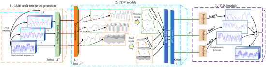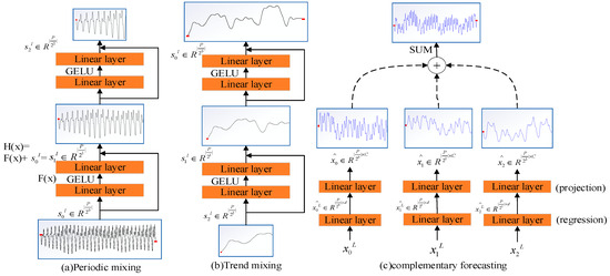 represent the mixing operations of periodic and trend information. As seen from Equation (5), TimeMixer uses stacked PDM modules to mix past information from different scales, allowing each layer to extract and mix multi-scale information from the output of the previous layer, which helps to capture complex patterns and high-level features in the data layer by layer, enhancing the model’s representational ability.
