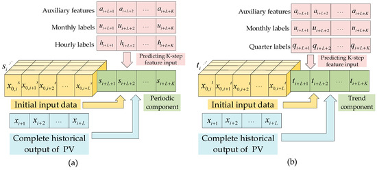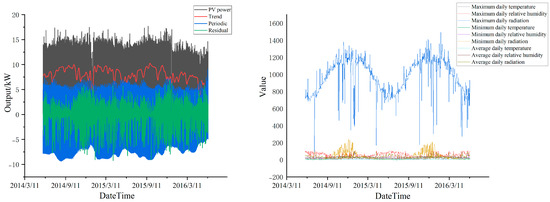 t, respectively. The periodic component represents the regular part of PV output, which can be observed as obvious and similar peaks in the curve. The trend component represents the smooth trend line in the time series with a small fluctuation amplitude. The residual part represents the fine changes caused by uncertain external factors. STL is a time series decomposition method that uses locally weighted regression as a smoothing approach. It uses locally estimated scatterplot smoothing (LOESS) to extract smooth estimates of components, achieving separation of different components [