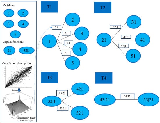 Vine Copula uses the “Vine tree” in graph theory to represent the correlation between different variables, which is represented by the connection of variable points. Commonly used modeling approaches like [