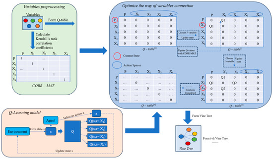 34] use Kendall’s rank correlation coefficients to measure variable dependence, then apply maximum spanning tree (MST) to select Vine trees with the highest coefficient sum. However, MST often yields locally optimal, suboptimal dependency structures. This paper proposes a novel Vine Copula structure optimization method using Q-Learning to select variable connections for Vine trees.