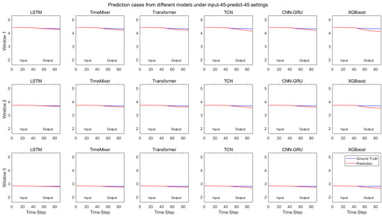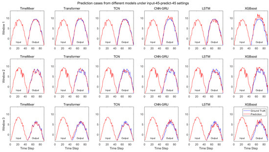 (2) In the deterministic forecasting of periodic components, the proposed TimeMixer model outperforms Transformer, TCN, CNN-GRU, LSTM, and XGBoost models with lower RMSE and MAPE. Across all test samples, the RMSE of the TimeMixer model was reduced by 0.1404 kW, 0.18 kW, 0.5304 kW, 0.6886 kW, and 1.4821 kW compared to other models, respectively. The MAPE was the lowest at 0.9167%, while the others were 1.1755%, 1.4022%, 1.8814%, 1.9549%, and 3.3816%, respectively. Compared to the second-best performing Transformer, it required 66 min of training time, a speed improvement of 24 min, and the total time was only 15 min slower than the fastest training LSTM.