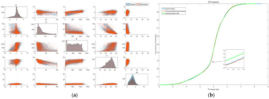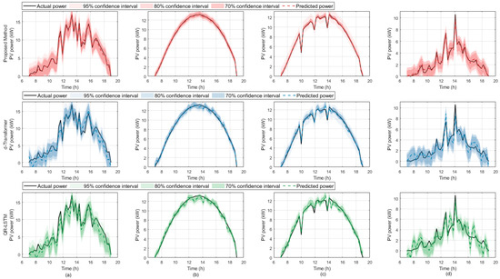 (1) Compared with the probabilistic forecasting of single models (d-Transformer, QR-LSTM), the proposed method fully utilizes various temporal features of the PV output time series and combines the advantages of different models to provide the most advanced prediction results. Firstly, modeling different features of the time series can effectively improve the learning ability of the model, greatly enhancing the accuracy of deterministic predictions. Considering the strong volatility and the laws at different scales of the periodic component, using TimeMixer to further decompose the past information of the periodic component and extract multi-scale temporal features can further improve the prediction performance. For the randomly unpredictable residual component, using the Vine Copula model for multi-factor correlation modeling can obtain conditional probability results that better reflect the real information. The proposed optimization method using Q-Learning for the Vine Tree can improve the model’s fitting power.