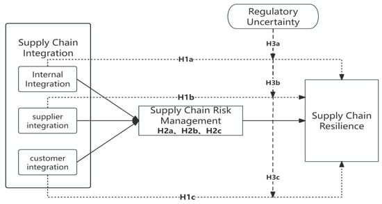 Compared to previous studies, the novelty of this paper’s hypothesis construction is reflected in the following aspects. First, it explores the mediating role of SCRM. By incorporating SCRM into the research model, this study addresses the limitations of previous research that often used the development of technologies like digitalization and blockchain as mediating variables [76]. Second, it introduces regulatory uncertainty as a moderating variable in the relationship between SCI and SCR, highlighting the varying impacts of SCI on SCR in different contexts. This contrasts with prior studies that focused on broader environmental uncertainty [68].