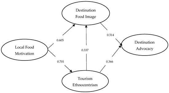 The hypotheses derived from the research model have been subjected to examination in the context of structural equation modeling (Table 2). The research findings indicate that the model evaluation is appropriate (χ2/df = 3.605, NFI = 0.905, RFI = 0.903, TLI = 0.907, RMSEA = 0.078, and CFI = 0.924). According to the results obtained from the structural model, local food motivation positively and significantly affects the destination food image (β = 0.805, p < 0.001). Similarly, local food motivation has a positive and significant effect on tourism ethnocentrism (β = 0.701, p < 0.001). Tourism ethnocentrism positively and significantly affects the destination food image (β = 0.337, p < 0.01). The destination food image has a positive and significant effect on destination advocacy (β = 0.514, p < 0.001). Additionally, tourism ethnocentrism positively and significantly influences destination advocacy (β = 0.366, p < 0.001). Based on these findings, it can be concluded that hypotheses H1, H2, H3, H4, and H5 have been supported (Figure 1).