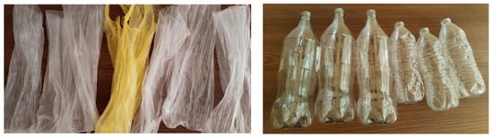 Two types of plastics were chosen to set three main categories of samples, PE, PET as control samples, and a mixture of both as a novel work, which were used with sand to manufacture building bricks. The sources relied upon for the materials used were waste PE bags and PET transparent water bottles after removing the covers and labels, as shown in Figure 1. Natural sand with sizes passing through a 1.18 mm sieve and retained on a 0.60 mm sieve was used, and the size was fixed to act as a control variable. Sand contains many oxides in its chemical composition, such as silicon dioxide (SiO2), aluminum oxide (Al2O3), iron oxide (Fe2O3), calcium oxide (CaO), and magnesium oxide (MgO), as well as minerals, such as feldspar and quartz. However, the specific chemical composition of the sand used remained undetermined, as it had not yet been subjected to analytical examination. Knowing that it is a dry mixture, the occurrence of a chemical reaction was not expected. The specific gravity of the sand was 2.67, bulk density 1608 kg/m3, and fineness modulus 2.87, while the density of PET plastic is 1.38 g/cm3, whereas the density of PE plastic is greater than or equal to 0.941 g/cm3. The chemical formula of PET is while its properties are highly flexible, colorless, and resistant to impacts. While the chemical formula of PE is and it has high ductility, high impact strength, and low water absorption.