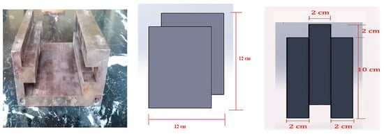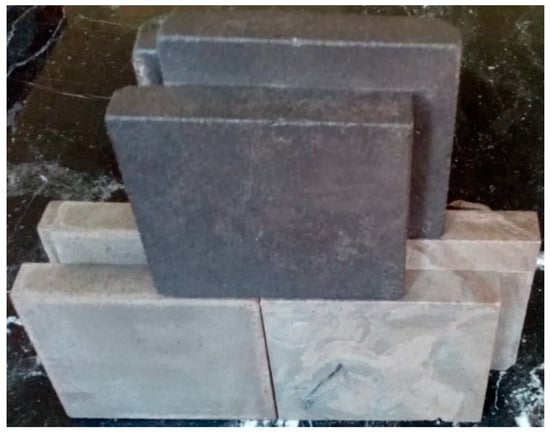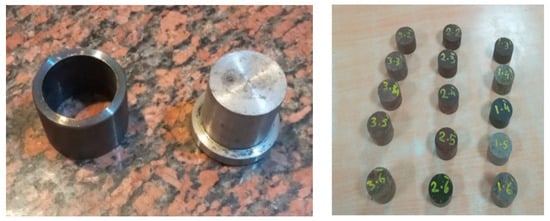 In this study, 45 samples were tested and divided into three groups of five different mixtures, with three ratios of samples for each mixture, for a total of 15 samples per group. In the first stage, small samples were used, consisting of cylinders with a diameter of 40 mm and a height of 50 mm, as shown in Figure 2, to reduce the quantity of materials used and to determine the best mixtures in terms of compressive strength, homogeneity, water absorption, and thermal conductivity. In the second stage, the best mixtures were chosen to manufacture the Lego-like bricks, as shown in Figure 3. A 20 mm thick steel mold was used to hold the mixture.