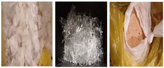 Prepared mixture components (at the (left) the shredded PE plastic, at the (middle) the shredded PET plastic, and at the (right) the sand).