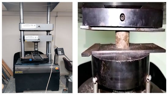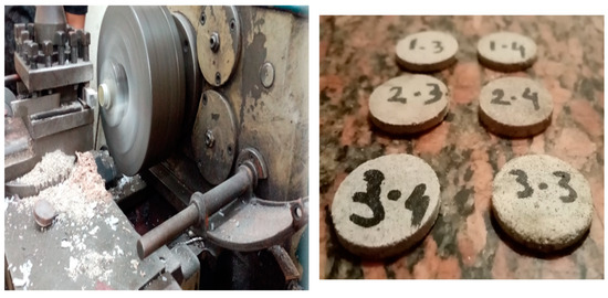 The axial compression test was performed using a DX-600 kN Instron Universal Testing Machine (Instron, Norwood, MA, USA), as shown in Figure 5. Samples were prepared to test the thermal conductivity using a lathe machine to obtain rings with a diameter of 26 mm and thickness of 15 mm, as shown in Figure 6. At room temperature, the water absorption test took place, and the samples were immersed in water for 24 h using tap water, which has fair temperature; their weights were measured before and after immersion, and the absorption was calculated as a percentage of the dry weight of the samples.