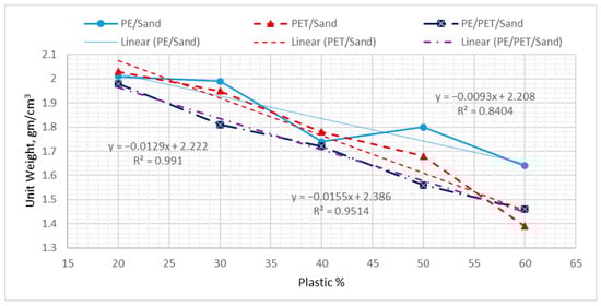- The unit weight of plastic bricks decreases as the percentage of plastic increases, and the PE/PET/sand samples were the least.