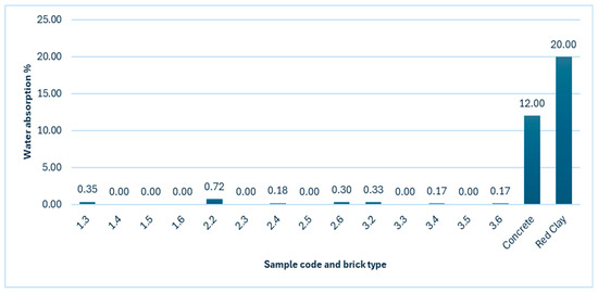 The water absorption of the samples was calculated as a percentage of the dry weight of the sample after being immersed in water for 24 h. The results of all plastic samples showed outstanding performance compared to traditional bricks, as the absorption percentages for all samples ranged between 0 and 0.35%, as shown in Figure 9. These results give plastic bricks an advantage in terms of efflorescence and durability. All the results were compared with the clay and cement bricks according to the Egyptian Standard Specifications ES:4763/2006 [23] for clay bricks and ES:1292-2/2005 [24] for cement bricks, which is technically equivalent to ASTM C62-23 [25] and ASTM C129-23 [26], respectively.
