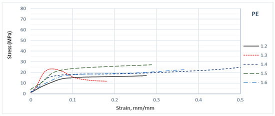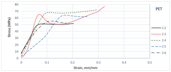 Figure 10, Figure 11 and Figure 12 show the stress-strain relationships for all samples after an axial compression test. Reviewing the stress results, the PET samples are the highest, as their results ranged between 50 to 76 MPa. The rest of the results showed similar values for the rest of the samples, and the results ranged from 9 to 38 MPa. Looking at the strain values, which are considered a measure of the ductility of the samples, the values range between 20 to 30%, which gives the impression that the plastic bricks can be considered ductile, in contrast to the brittle nature of the clay and cement bricks. The results show that the samples exceeded the red and cement brick values by at least five times.