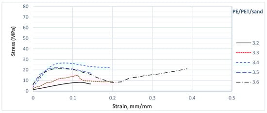 While, as illustrated in Figure 12, the 3.4 sample with an equal mixture of PET and PE with sand had the highest strength at 26.64 MPa.