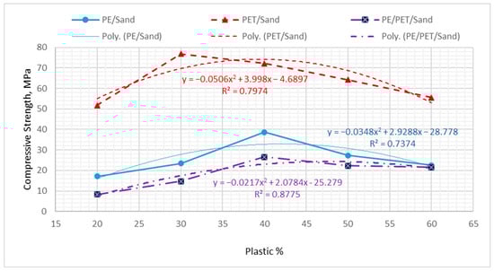 Increasing the percentage of plastic affects the strength values. Figure 13 shows the relationship between the plastic percentages and the compressive strength values for all samples. Interpreting the curves and trend lines, the optimal plastic percentage ranges between 30 and 40%. The equations given on the curves can be used, as the R2 values range between 0.74 and 0.88.