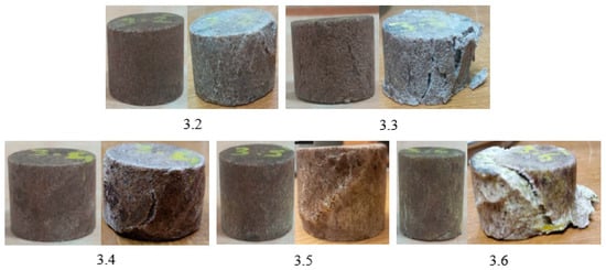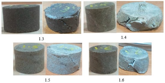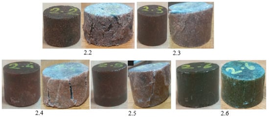 The fracture patterns of all samples were studied. Figure 14, Figure 15 and Figure 16 show the fractured samples after the axial compression test for PE, PET, and PE/PET mixtures, respectively. The predominant fracture pattern in all samples was the tensile failure proved by longitudinal tensile cracks, with shear failure occurring in a small number of samples, such as the 30% PET sample, which gave the highest compressive strength value. The PE samples showed clear ductile failure, most notably the 40% PE sample, which acted like mild steel under compression.