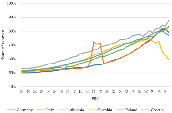 Share of women in the older population in the studied countries. Source: own elaboration on the basis of [58].