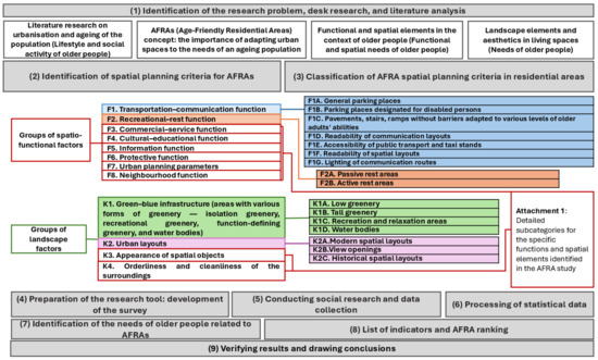 The research began with defining the research problem and conducting a literature review on urbanisation and ageing, with a particular focus on the needs of older people. Criteria for older adults in AFRAs were then identified and grouped into functional–spatial and landscape factors (Table A1 and Table A3). The next step involved developing a survey to collect data from older people about their needs. The collected data were then statistically analysed, and based on this analysis, a list of indicators was created, and a ranking of AFRAs was conducted. The final stage involved verifying the results and formulating conclusions (Figure 2).