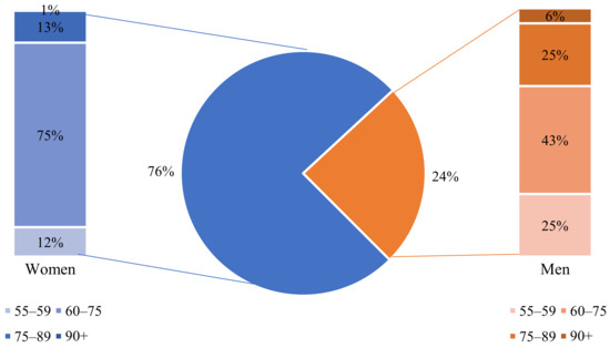 The questionnaire survey was conducted on a population sample of 1815 respondents, 76% of which were women. The age structure of the population sample was as follows: 55–59—15%, 60–75—67%, 76+—18%. Most of the female (75%) and male (43%) respondents belonged to the young old group (60–75) (Figure 3).