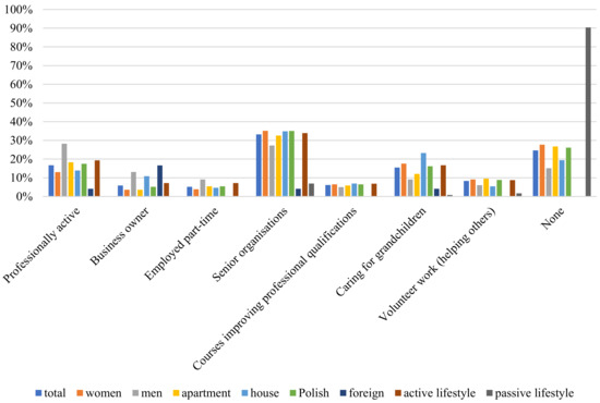 The majority of female respondents were members of organisations for older people (35%) and were not engaged in any professional or educational activities (28%). Very few of the retired women owned businesses or were employed part-time (4% and 5%, respectively). Conversely, most male respondents were professionally active (29%) or belonged to organisations for older people (28%), while the smallest proportions of retired men were improving their professional qualifications (6%) or were involved in volunteer work (6%).
