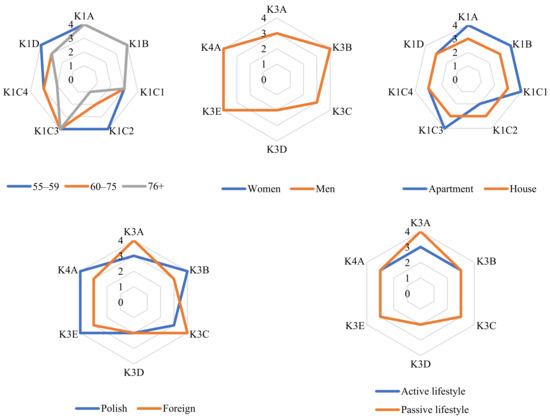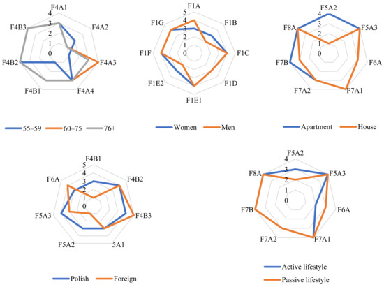 Afterwards, each factor in each category of components was ranked based on its perceived importance in the conducted survey. Cumulative frequency series and median values were used for the entire population sample. A similar comparison was then conducted regarding age, gender, accommodations, and country of origin of the surveyed older citizens, and their lifestyles in terms of activity (Table A2 and Table A4, Figure 6 and Figure 7).