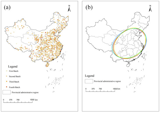 Distribution map (a) and standard deviational ellipse (b) of key rural tourism villages.