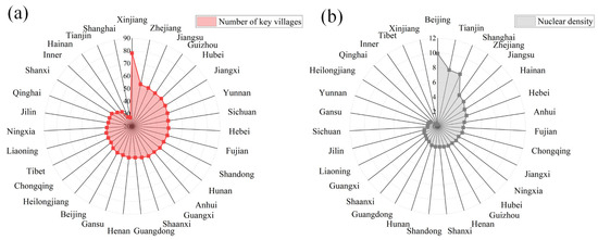 Number of key rural tourism villages (a) and kernel density distribution (b) by province.