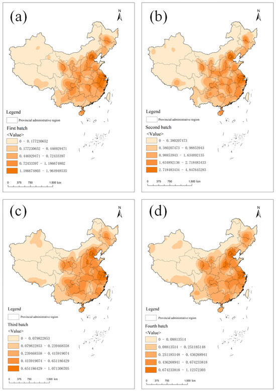Based on the density distribution map of key tourism villages, we can observe the spatial density characteristics and their changing trends across different batches (Figure 3). In the first batch, regions with high density were mainly concentrated in East China, the central region, and the southwest, with Beijing, Jiangsu, and Zhejiang provinces having the highest densities. These areas have advantages in early rural tourism resource development, with developed economies, convenient transportation, and well-established infrastructure. The central regions, such as Henan and Hubei provinces, also show high village densities due to their geographical centrality, abundant natural resources, and rich historical and cultural heritage. The second batch of key villages maintains a high density in East China, particularly in Beijing, Jiangsu, and Zhejiang provinces. Central regions such as Henan and Anhui provinces also exhibit higher densities. In the third batch, high-density areas continue to be in East China, such as Beijing, Jiangsu, and Zhejiang provinces. There has been a significant increase in density in North China, especially in Hebei province, indicating progress in rural tourism development in this region. The fourth batch showed that East China, including Shandong, Jiangsu, and Zhejiang provinces, still has the highest density of key villages. The central regions, such as Henan and Anhui provinces, maintain relatively high density levels, while the southwest region, including Sichuan province, also has a high density. Across all four batches, the western regions consistently showed the lowest density, which is largely related to the vast area of these provinces.