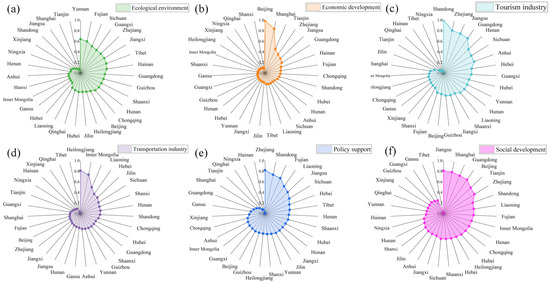 Policy support dominance reflects the level of support from local governments in terms of policy formulation, financial investment, and project implementation (Figure 4e). Effective policy implementation can significantly enhance the quality and competitiveness of rural tourism development. Zhejiang, Shandong, and Liaoning are particularly prominent in policy support dominance. Zhejiang has promoted the construction of beautiful villages and the creation of rural tourism demonstration sites through a series of policy supports and financial investments. These policy measures have not only improved the infrastructure level of rural tourism but also increased the participation of and benefits for local residents. Similarly, Shandong has implemented active policies, such as supporting rural tourism demonstration counties and protecting traditional villages, significantly enhancing the efficiency of tourism resource development and sustainable development capacity. Liaoning’s policy support is reflected in the comprehensive development and protection of rural tourism resources, particularly in ecological protection and cultural heritage preservation, achieving notable success and promoting comprehensive rural tourism development. Henan, Hebei, and Hunan provinces also show significant policy support. However, regions like Ningxia, Qinghai, and Xinjiang have certain shortcomings in policy formulation and implementation. Due to a weak economic foundation and insufficient policy enforcement, rural tourism development in these areas is constrained.
