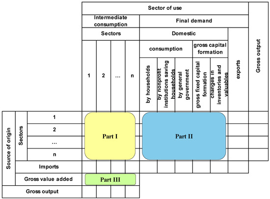 22]. The fundamental information used in an input–output analysis concerns the flows of products from each sector, considered as a producer, to each of the sectors, including itself and others, considered as consumers. Three parts of input–output tables are distinguished. Part one, labeled intermediate uses, contains interindustry exchanges of intermediate products [