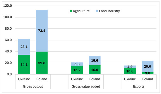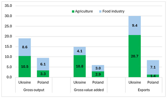 As mentioned earlier, although 2020 was the first year of the COVID-19 pandemic, it did not significantly affect the structures of the agri-food sectors in the analyzed countries. The gross output and value added (denoted in input–output tables in current basic prices) of the Ukrainian agriculture and food industry in 2020 were higher than in 2019. However, caution should be exercised when determining the future direction of Ukraine′s agri-food sector. The war in Ukraine has caused significant disruptions in the sector, manifested by a decline in gross output, value added, and exports in 2022. According to the State Statistics Service of Ukraine, the value added in agriculture (at the 2021 constant prices) was 25.2% lower than in 2021 [