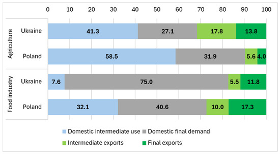 40], changes in the structure of gross output of the Ukrainian food industry may take the following directions. In the distribution of gross output, the significance of domestic final demand should decrease in favor of increasing the share of material intermediate consumption and exports. This direction of change was particularly evident in Poland’s food industry, which benefited from participation in the Single European Market [