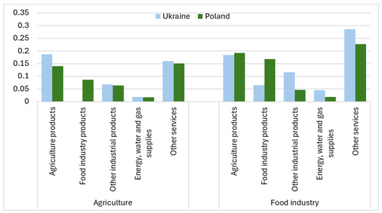 Fourthly, the comparison of the direct domestic material intensity coefficients of the food industries in Ukraine and Poland shows contradictory conclusions. On the one hand, intra-sectoral supply in the production of food industry products in Ukraine was relatively small, which indicates the initial stage of development of the sector. On the other hand, products from other industrial sectors and services were relatively important. These characteristics usually belong to food industries in highly developed countries around the world.